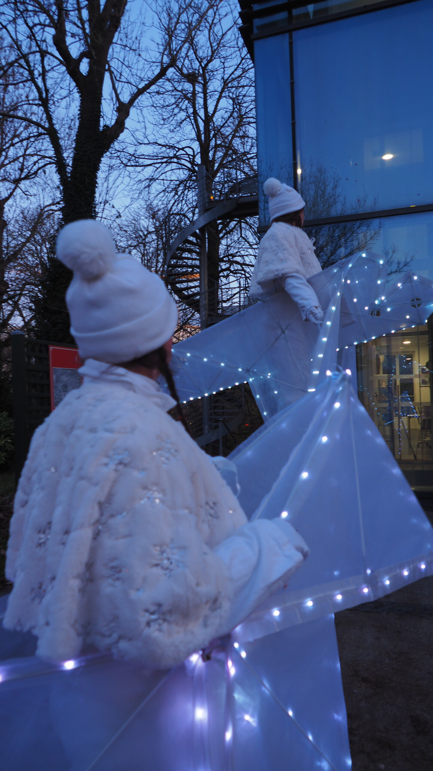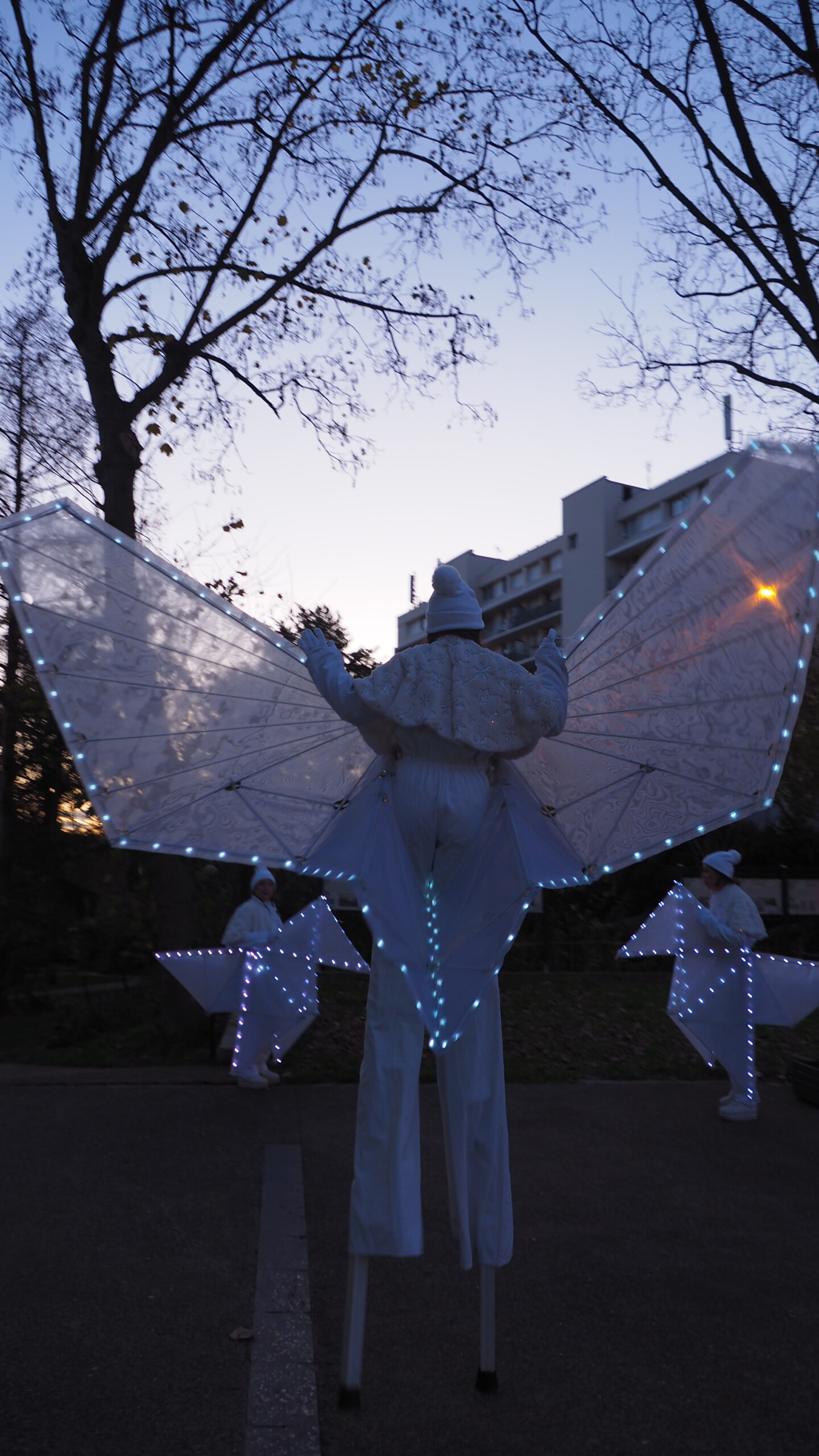 Les Origamines, deux cocottes en papier et un aigle sur échasses, parcourent les rues en interprétant des cantiques de Noël poétiquement et absurdement détournés. On y parle des aspects méconnus de la grande fête :