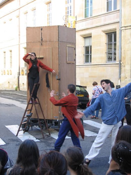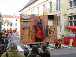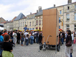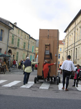 Puis arrive le grand jour. Patrick et Eric ont passé deux nuits blanches pour offrir une version montrable et jouable de la maison. La maison n'est pas peinte de l'extérieur mais à l'intérieur c'est vraiment joli. Ça me fait un peu penser à du Magritte. On a prévu trois sorties par jour, au cœur du marché historique. La première est erratique mais les comédiens sont détendus, de bonne humeur, du coup la deuxième sortie attire une demande de bis et la troisième devient très participative.