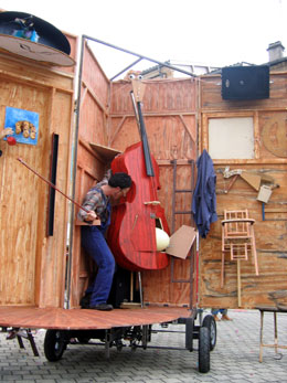 27 Juin : un petit coup de N4 et nous voilà à Bar-le-Duc, au Labo. Le labo, c'est un ancien local d'entreprise qui sert d'entrepôt et d'atelier pour le festival. Nicolas y règne en maître avec une équipe de bénévoles haute en couleurs qui se retrouve plus ou moins régulièrement pour y préparer les décors, panneaux et visuels qui personnalisent chaque édition de Renaissances. Des itinéraires personnels pas évidents unis dans une même chaleur humaine. On y retrouve Patrick & Eric et nous nous faisons initier au passage à une géniale spécialité locale : le vin de rhubarbe. Le labo est très sympa mais peu pratique pour les constructions de moyenne ou grosse ampleur : il y manque un grand atelier et même si Patrick a réussi à y caser sa maison, on est obligé d'y multiplier les manœuvres pour bosser dessus, problème d'autant plus ardu quand il pleut. La maison se déplace comme un tricycle, traction par pédalier, avec un guidon genre Harley très jubilatoire à voir. La contrebasse, qui doit faire une fois et demi la taille d'une normale, est en place. Pour le reste, il y a encore beaucoup de boulot et on se dit que ça ne va pas être simple de finaliser et la déco et le jeu en une petite semaine.
