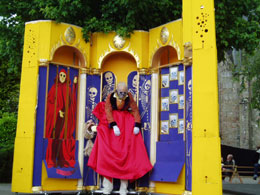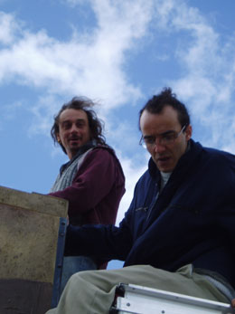 Trois jours de recherche et d’approfondissement au cœur de juillet, entre deux tournées. Une journée pour la maison marron, une autre pour la rouge, une dernière pour la jaune. Nous sommes à Champigny, dans le hangar qui abrite provisoirement ces maisons qui n’entrent pas dans notre local. Marthe, qui n’a pas tous les éléments pour répéter ses manipulations, fait contre mauvaise fortune bon cœur. Nous refaisons avec Laurent le parcours de Joe Pataud, parcours qu’il connaît maintenant mais dans lequel il doit pouvoir prendre ses aises. Objectif : élargir, alléger, et trouver cette atmosphère à Buster Keaton qui collerait bien à la maison. En début d’après-midi, après une petite préparation, Louis prend la peau de Joe, se jette dans son parcours et en ré-improvise, à l’arrache, toutes les étapes. Il l’aborde avec une telle décontraction que tous les objets prennent un nouveau sens et on se prend quelques bonnes bosses de rire au passage. Alors que c’est une faute que tout metteur en scène se doit d’éviter absolument : montrer au comédien comment il faut faire, ici nous avons un élargissement. Laurent se dit que dans son parcours millimétré, oui, il y a de la liberté et de l’inventivité. A lui de se la créer, à nous de l’y aider. Au cours de la séance, la contrebasse, mal arrimée, tombe soudain et Patrick, qui est venu jeter un œil entre deux constructions, n’a que le temps de se jeter pour la rattraper et s’égratigne au passage. Du coup, on va travailler provisoirement dans un espace libéré et inventer des moments qui ne sont pas dans l’histoire, toujours dans le but d’élargir le jeu du personnage. La Maison Rouge bouge aussi. Eric Traissard n’étant pas dispo pendant le mois de Juillet, on a raccourci la bande son avec Olivier, comme on pouvait mais avec un résultat plutôt satisfaisant. L’histoire de Red Lerouge faisait quatre minutes de plus que les autres et le rythme, forcément, en souffrait. Du coup, avec un montage resserré, tout se précipite et il faut reprendre de nouvelles marques. Les accessoires de l’histoire s’enrichissent également : la chimère qui a maintenant quatre avatars différents, et les récipients pour ingurgiter les boissons, qui vont d’un simple verre à un plein seau. Par ailleurs, c’est le moment maintenant de tempérer le jeu et le densifier. Je me rends compte qu’on a, dans les premières approches, voulu remplir absolument, au risque de la gesticulation. Prenons le temps de la présence et des articulations ciselées. Dingue le temps qu’il faut pour parfaire 9 minutes. Travail d’artisan, pour lequel Mika et Jacot s’entendent comme larrons en foire. Vient le jour de la Maison Jaune, elle aussi trop gesticulée. Trouver la bonne approche, le bon rythme, des bases solides pour le jeu. Personnage et maison doivent pouvoir dialoguer mais sans s’enfermer dans un tête à tête. On essaie de nouvelles bases de jeu : Solo se fait son show devant le public-miroir en dépit d’une maison qui l’amène à la mort. Le jeu de Sam se précise et la maison, ce faisant, existe davantage. Entre le délabrement d’icelle et le sien propre, avec cette nécessité de s’offrir néanmoins bon visage dans le miroir public, il s’invente des chemins nouveaux, trouvant dans cette double contrainte la nourriture qui lui manquait. En fin de séance, Djamel nous fait pivoter la maison, puis tressauter. L’image tangue. C’est bouffon, c’est tragique, c’est magnifique. Impressions allègres de fin de répétition mais qu’il va nous falloir solidifier et pérenniser pour le spectacle. On a fait cependant un pas décisif et je sens du soulagement autour de moi. Trois jours, c’est trop court. Il faudrait trois semaines. Le terrible c’est que, même aidés pour cette création, nous sommes tellement fragiles financièrement qu’on ne peut pas s’offrir le luxe de ces trois semaines qu’on ne peut pas payer. D’autres dates nous attentent et nous pressent, qui nous fournissent aussi les moyens de survivre. Alors… On se retrouve en fin de mois pour reprendre le travail et préparer Malbrouck.
